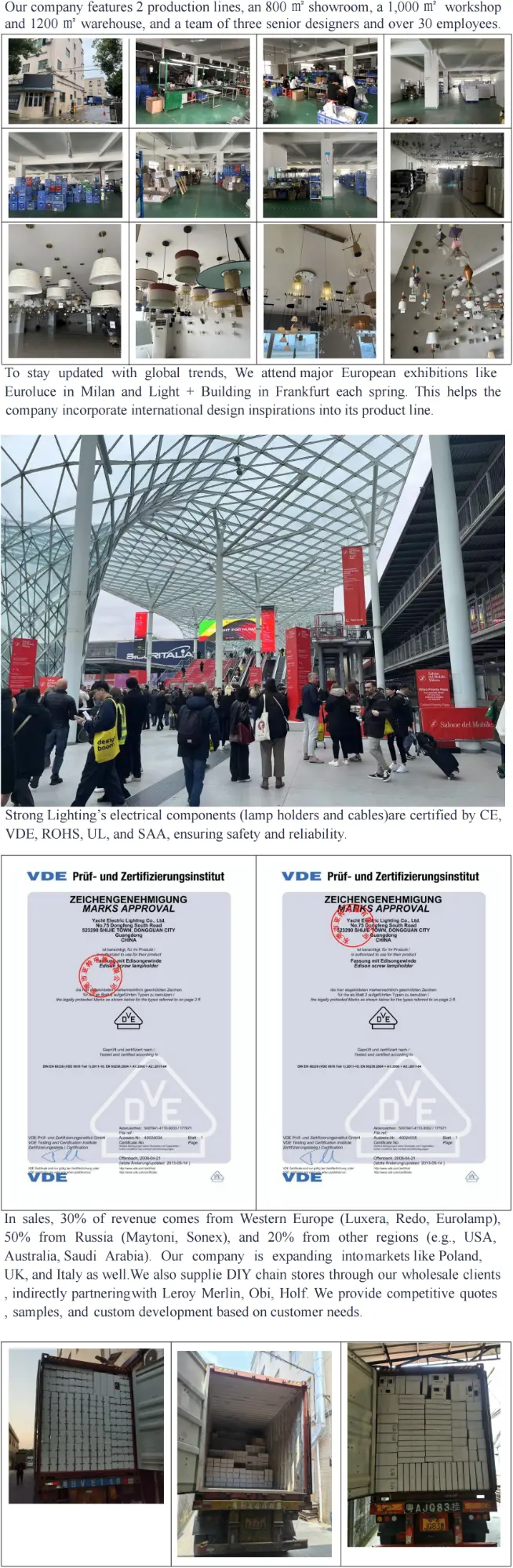 Zhongshani Guzheni linna valgustuskeskuses juurdunud Strong Lighting ammutab inspiratsiooni ülemaailmsetest suundumustest Milano Euroluce'i ja Frankfurt Light + Building'i näitustel, tagades, et meie disainilahendused jäävad tööstusharudest ees. Meie 1000 ㎡ töökoda ja kaks tootmisliini toetavad 100 x 40 HQ konteinerite aastatoodangut, mis võimaldab meil käsitleda suuremahulisi hulgitellimusi ühtlase kvaliteediga.
